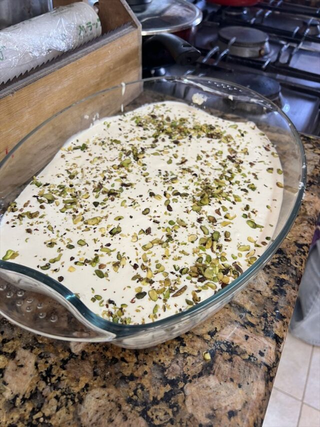 こちらのデザートは、アラブの牛乳プリンのようなものです。セモリナ粉と呼ばれるヨルダンのお菓子によく使われる小麦粉のような粉と砂糖、牛乳を混ぜて作ります。層になっていて、上にはキシュタと呼ばれるクリームと生クリームの粉を混ぜたものをかけます。最後にピスタチオをたくさんかけたら完成です。混ぜて冷やすだけの簡単なレシピですが、シロップをたっぷりかけると絶品です。
