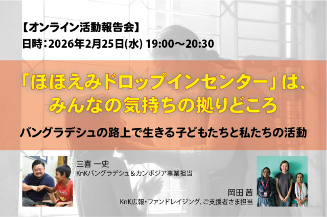 現在実施中のバレンタイン&ホワイトデー「+1」キャンペーン期間に行う本報告会では、バングラデシュ事業担当の三喜一史(みきかずふみ)と広報担当の岡田茜が、子どもたちが直面している課題をはじめ、活動の具体的な内容や現在力を入れている活動について、15年の活動の成果もふまえながらお話します。また、報告会タイトルに付けた「『ほほえみドロップインセンター』は、みんなの気持ちの拠りどころ」とはどういうことか、現地の子どもたちやダッカの人々との出逢いのエピソードや、直接コミュニケーションを取ることで得られた気づきや学びからお伝えします。